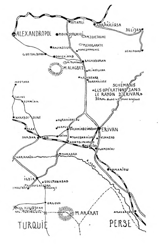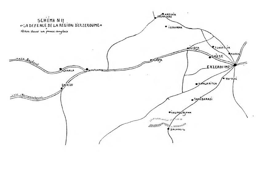 5th Region of Erivan. — General Abatsieff: 14 battalions, 32 guns; 24 sotnias of Cossacks intended to penetrate into the valley of Alachkert and to cover the line of communications Erivan–Dilijan–Tiflis.