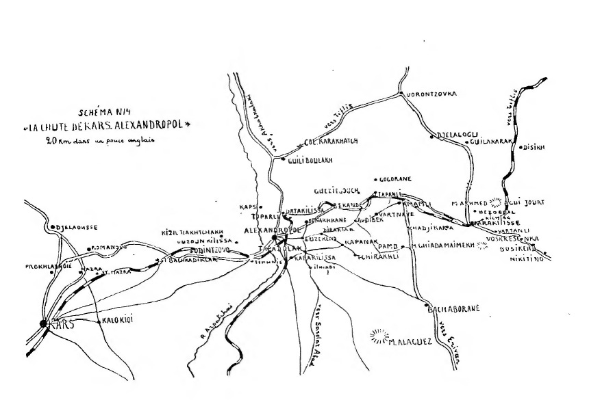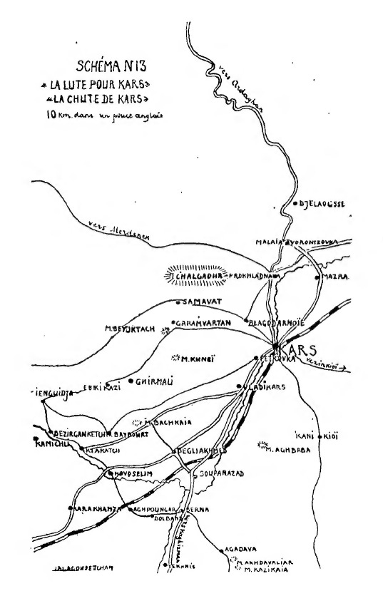 General Vyshinsky: “I answer your questions after reporting to the corps commander. The fate of the forward positions held by the Begli-Ahmed detachment was decided yesterday as a consequence of General Odishilidze’s order to cease hostilities and send parlementaires. This order has an unfavourable effect on the fighting capacity of the troops. However, it does not concern the troops at Kars, and Kars could still have been held for 15 days or perhaps a whole month. A refusal of the Turkish proposals, very well founded even this morning, could have saved the situation, and the Kars fortress would, beyond any doubt, have resisted the Turks; even today the fortress defended itself very courageously until receiving the order of the head of government, Chkhenkeli, and General Odishilidze to send parlementaires to determine the conditions for evacuating the fortress. After this order was passed to the commandant of the Kars fortress, the fighting ceased. The troops withdrew from the forward position Aghach–Ak-baba–Garam-Vartan by order, although there were cases where some elements withdrew on their own initiative.”