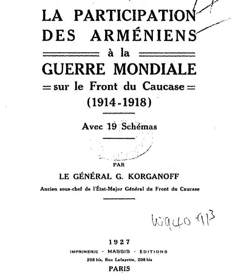 Korganov wrote a memoir of his involvement in these events in 1927, while in exile in France, entitled, La participation des Arméniens à la guerre mondiale sur le front du Caucase (1914-1918) avec 19 schémas. The book was originally published in French and Emanuil Egiaevich Dolbakyan created a Russian translation. A rough English translation is given below. Korganov died in Paris on 8 January 1954 and is buried in the Père Lachaise Cemetery.