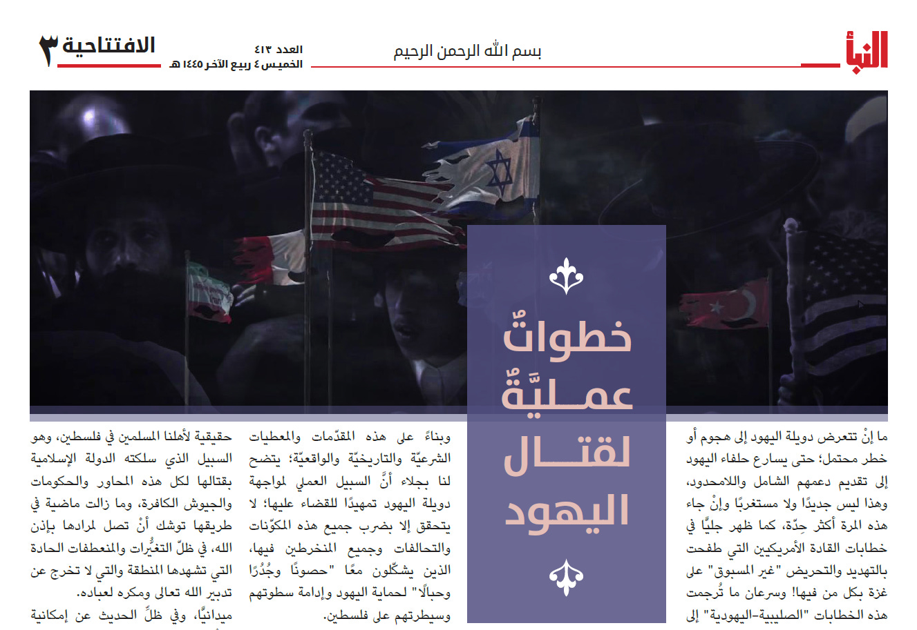The main editorial in the 413th edition of Al-Naba, the newsletter of the Islamic State (IS), published on 19 October, was entitled, “Practical Steps to Fight the Jews”.