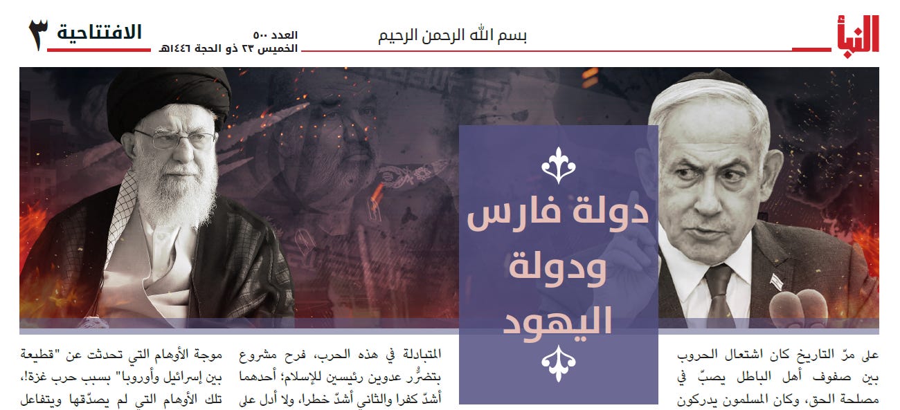 The main editorial of Al-Naba 500 on 19 June, entitled, “The State of Persia and the State of the Jews”, was a theological-strategic argument. IS had three broad points. First, that scripture and the sacred historiography of Islam make clear Muslims should be pleased Iran and Israel are at war, since they are both infidel powers and thus any damage they do to one another is welcome in itself, as well as possibly opening up opportunities for the jihadists. However, (point two) by IS’s reckoning Islam does not permit Muslims to actively take a side in an intra-infidel clash, yet many Muslims have violated their creedal obligations by siding with Iran because (point three) “the Palestinian cause” has become an improper object of veneration for too many Muslims, a nationalist idol that leads to neglect of other Islamic responsibilities and can be manipulated to lead Muslims astray, as has happened with (Sunni) Muslims supporting Iranian Shi’is just because they claim to be fighting for Palestine.