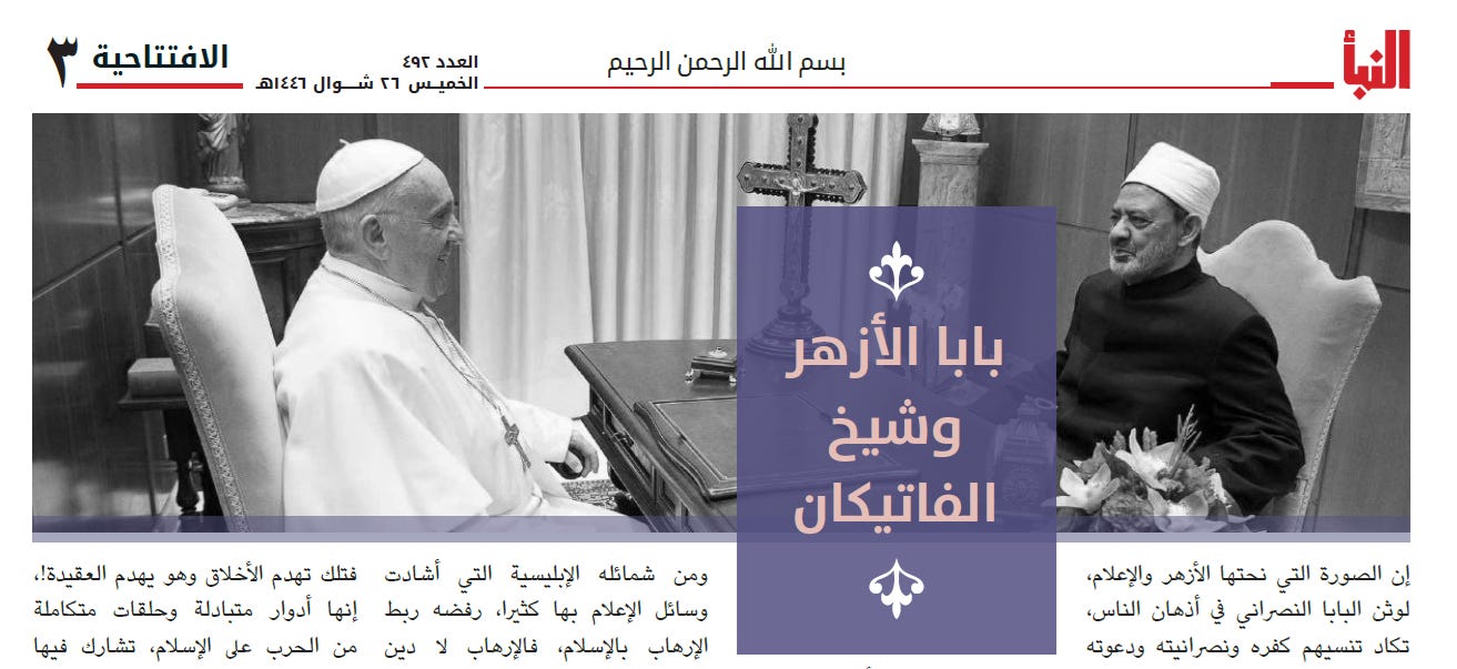The head of Al-Azhar not only “mourned [Francis] as a ‘brother and friend’,” according to Al-Naba 492, but suggested there was a bond “beyond ‘humanity’” because the late Pope had been part of the Jesuit Order, with its “mixture of ‘contemplation and social effort’, making him, in this sense, Azhari in method!” All of this was of a piece with Al-Azhar going “beyond [condolences] to praise, commendation, glorification, and veneration [of Francis], as though they were Vatican trumpets and preachers of popery!” IS ridicules Al-Azhar for elevating the Pope in this way when he was criticised from within his own Church for doctrinal laxity, “such as his refusal to condemn homosexuals” (the word used is “shawadh”, lit. “deviants” or “perverts”). IS also lists Francis’s “rejection of linking terrorism to Islam” as among his “devilish traits, which the media lauded abundantly”.