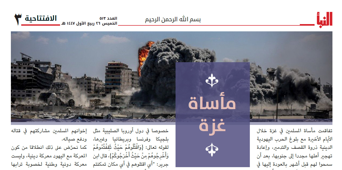 Al-Naba 513 opens the editorial by saying the situation as getting worse for Gazans and then came, on 9 September, “the Jewish army’s bombing of the statelet [duwayla] of Qatar, ‘the mediator’, in the middle of its capital and centre of sovereignty, to which the latter responded with an emergency Arab summit that gathered together at one table America’s protégés, including the ‘New Syria’, and they asserted with one voice that these Jewish practices ‘undermine the efforts for peace’! Notably, the Jewish escalation from Palestine to the Gulf coincided with the anniversary of the signing of the ‘Abraham Accords’ for peace!”5